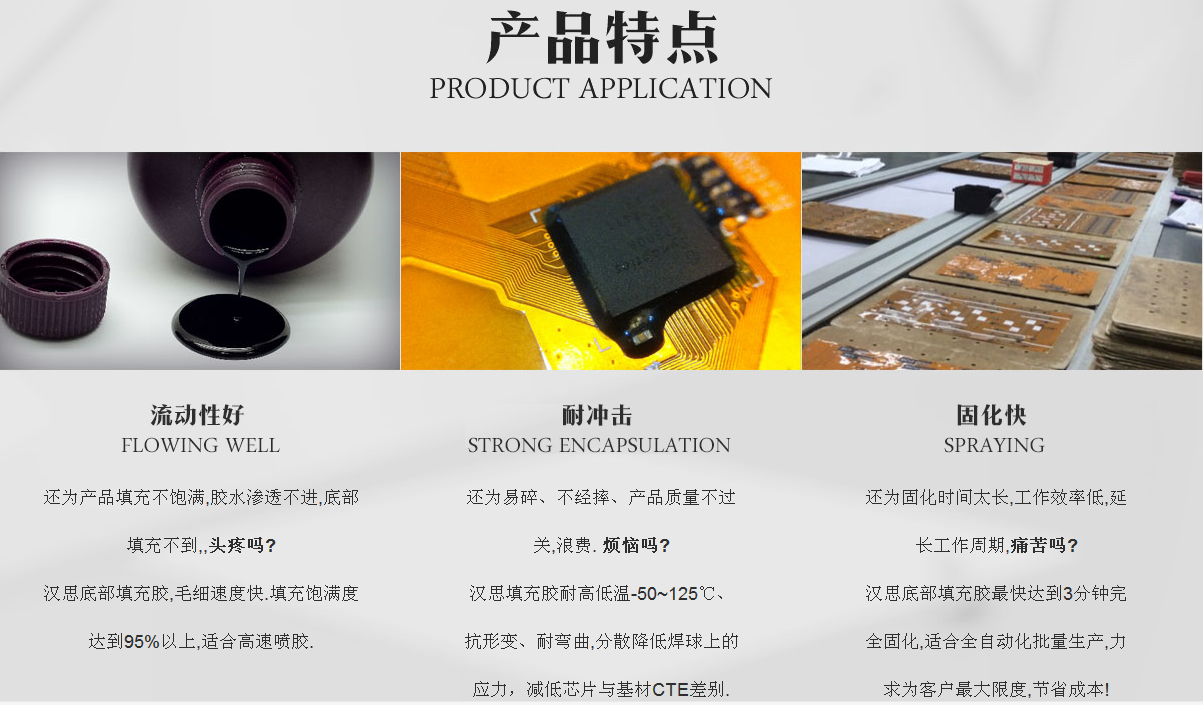 汉思底部填充胶特点有可返修、快速固化、无空洞、快速流动,具有良好的粘接强度和可靠性。通过了双85测试。
